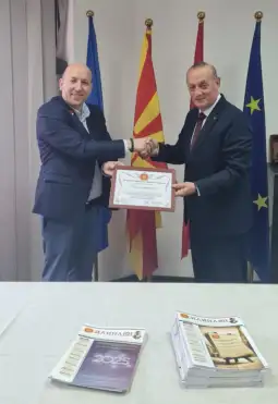 Тирана, 4 април 2025 (МИА) - Во просториите на Македонската амбасада во Тирана, претседателот на Македонското друштво „Илинден“ Никола Ѓурѓај  денеска му врачи благодарница на Љуфтим Спахиу, вршител на должноста амбасадор, што друштвото му ја додели по повод 16-годишнината од формирањето.