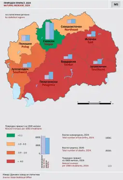 - Jetëgjatësia në Maqedoni u rrit për një vit dhe arriti në 76,6 vjet, por vendi vazhdon të përballet me rritje natyrore negative. Në vitin 2024 kanë lindur 16.061 fëmijë, ndërsa kanë vdekur 20.201 persona, që do të thotë një rënie e popullsisë prej mbi 4.000 banorësh. Rritje pozitive ka pasur vetëm rajoni i Shkupit, ndërsa në rajonet e tjera numri i vdekjeve e tejkaloi ndjeshëm numrin e lindjeve.