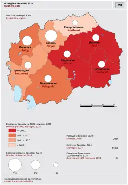 Një rritje pozitive pati vetëm në rajonin e Shkupit, kryesisht në Saraj (+8.4) dhe Çair (+5.5 për 1.000 banorë). Rënia më e madhe ishte në Novo Sellë (-14.8) dhe Novac (-13.7). Numri i martesave vitin e kaluar u ul për 1.600, dhe divorcet u rritën për 259. Numri më i lartë i divorceve për 1.000 martesa ishte në rajonet e Vardarit, Lindjes dhe Juglindjes - mbi 200.