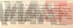 „Вие се стегате да напишете ‘од Македонскиoт комитет’. Тоа име нема да загине, и поради тоа велам, без зборот ‘Македон’, Вашите писма ќе бидат враќани назад. И, молам - известете ги сите комитети“, пишува Калмиков.
