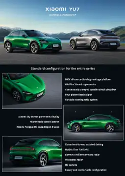 Најновиот модел, Xiaomi YU7 со пет седишта, во Кина се продава по цена од околу 30.000 евра (253.500 јуани). Тоа е второто електрично возило на Xiaomi и е за малку поевтино од Model Y на Tesla, кој започнува од 31.300 евра (263.500 јуани) и е најпродаваниот џип во Кина.