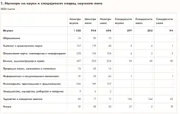 Според податоците, во 2025 година Македонците најмногу сакале да магистрираат или специјализираат во делот на бизнисот и правото. Од 1.558 магистерски трудови, речиси една третина биле во оваа област – 497. Имало и голем интерес за инженерство, производство и градежништво – 256 магистерски трудови, а за општествените науки – 230.