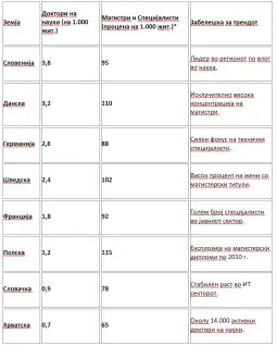 Според податоците од националните институции за статистика и Евростат, Македонија по бројот на доктори на науки се доближува до Словенија (која има 3,8 доктори на науки на 1.000 жители), што претставува една од највисоките стапки во Европа. Следна е Данска со 3,2 доктори на науки на илјада жители. Од регионот, најмалку доктори има во Бугарија и Србија – таму еден доктор на науки има на секои две илјади жители.
