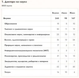 „Најголем број од лицата, 25,3%, докторирале во областите здравство и социјална заштита; во бизнис, администрација и право – 14,7%; во инженерство, производство и градежништво – 12,7%; во уметност и хуманистички науки – 12,2%; следат областите општествени науки, новинарство и информирање со 10,2%, а останатите области се со помал процент на застапеност“, пишува во извештајот на Државниот завод за статистика.